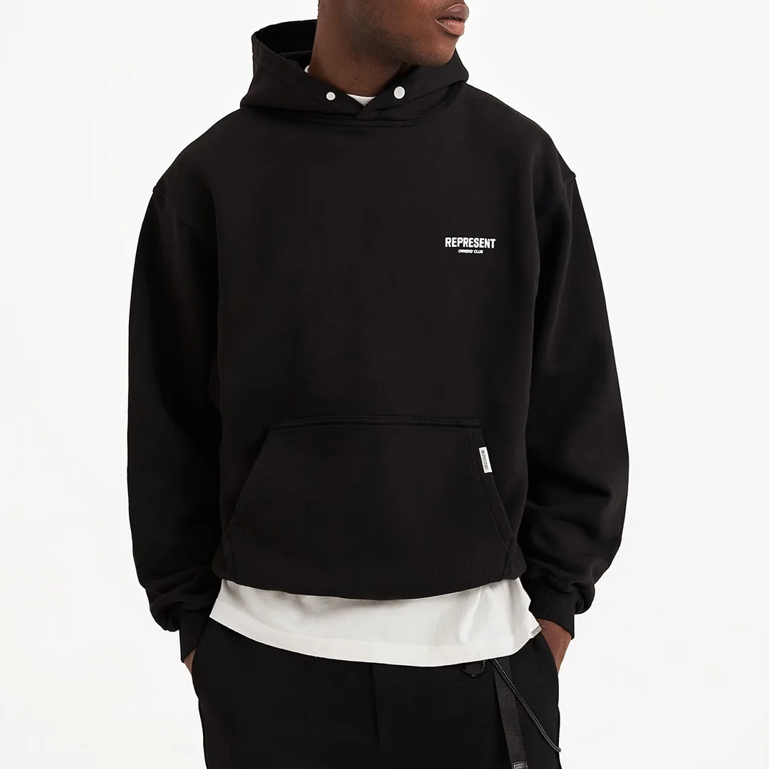 Introducing the Represent Owners' Club Hoodie in Black. A slightly oversized black hoodie, crafted from a heavy weight jersey cotton. The hoodie is super soft, pre-shrunk and piece dyed for the ultimate jersey. It features a ribbed hem and cuffs for the perfect fit, finished with our Owners' Club print to the chest & back.